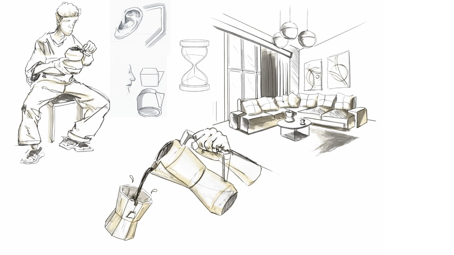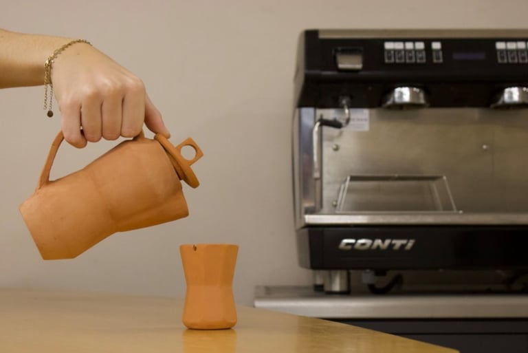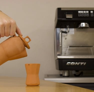 Cette réflexion a conduit à une silhouette inspirée du sablier, symbolisant le temps et l’invitation à ralentir. Une dimension sensorielle s’y ajoute : le bec évoque l’odorat par les arômes, tandis que la hanse suggère l’ouïe à travers le son du liquide. L’objet associe ainsi geste, forme et expérience.